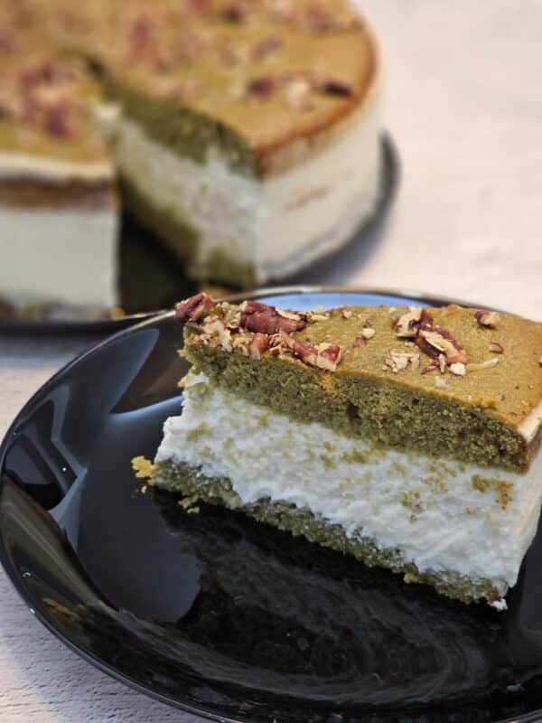 עוגת גבינה עשירה ולא כבדה מעוטרת בשכבת מאצ'ה תחתונה ועליונה בתוספת שוקולד פיסטוק ובעיטור פקאנים.ההנאה מובטחת :)