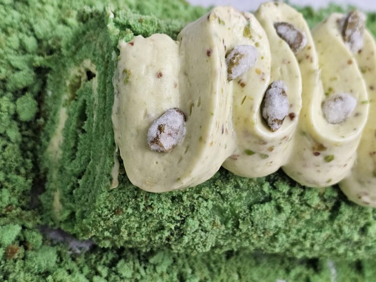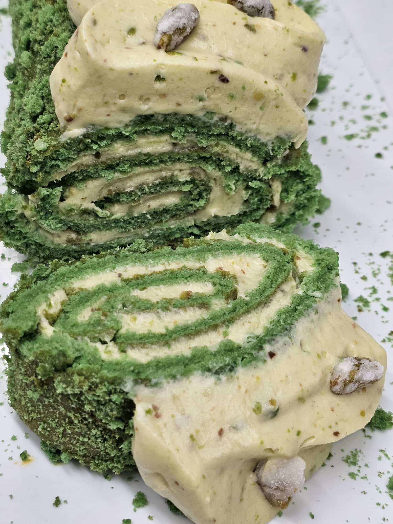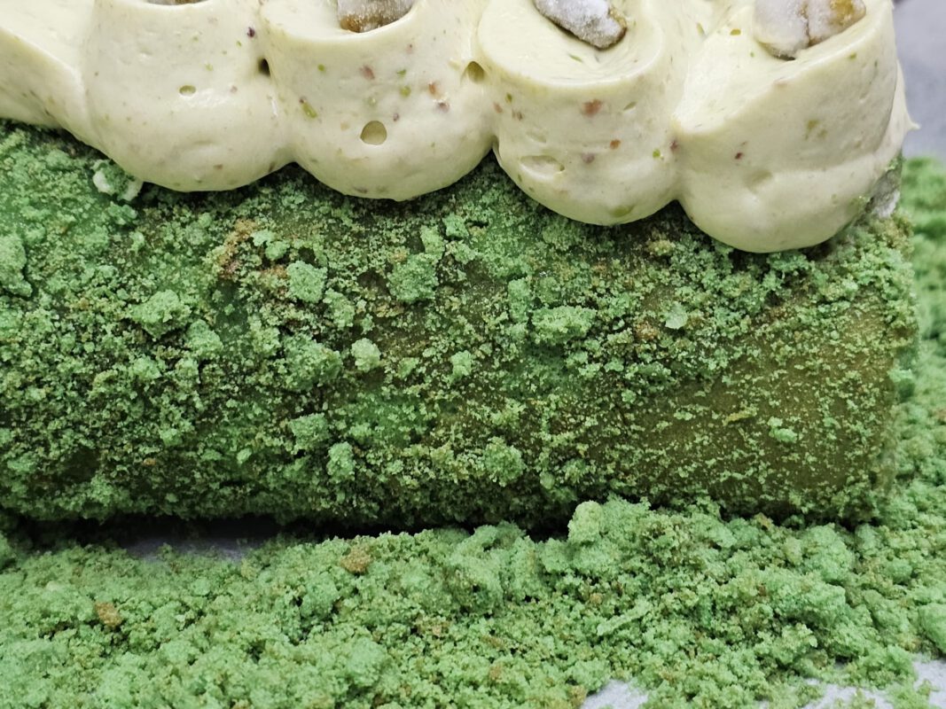ספוג פיסטוק ממולא בקרם שנטילי פיסטוק מעוטר בפיסטוק מסוכר עטוף בפירורי פיסטוק קראצ'ים.