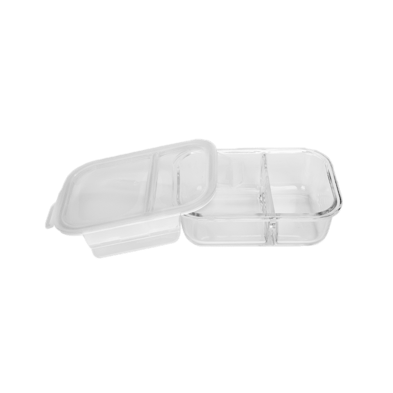 קופסת זכוכית מלבנית מחולקת המיועדת לאחסון מזון. הקופסה בטוחה לשימוש בתנור, במיקרוגל, במדיח הכלים ובמקפיא. המכסה נטול BPA.