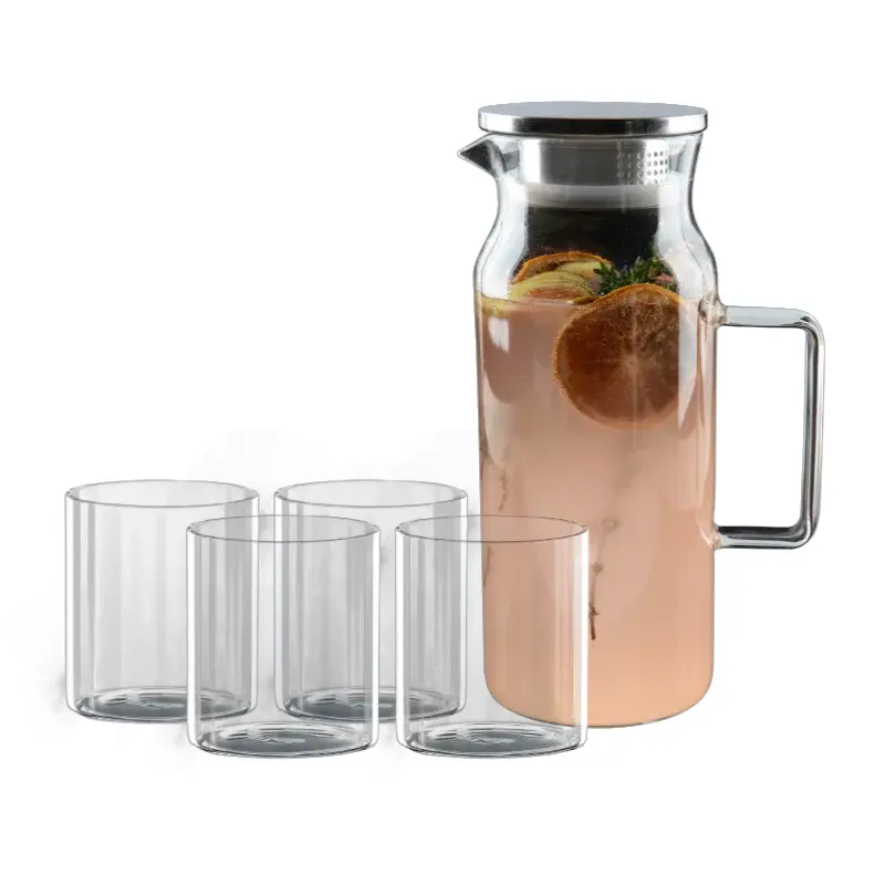 סט קנקן זכוכית עם מכסה 1.5 ליטר+4 כוסות 320 מ"ל