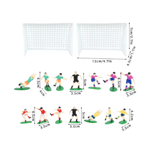 סט קישוטים מושלם לעוגת יום הולדת בנושא כדורגל! כולל שחקני שדה ושערים – מתאים במיוחד למסיבות של אוהבי ספורט וילדים חובבי כדורג